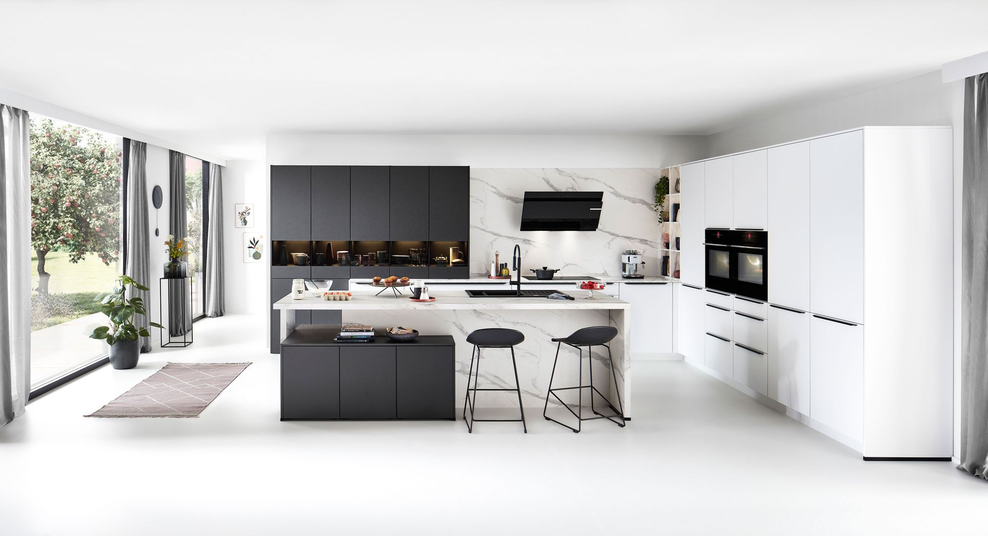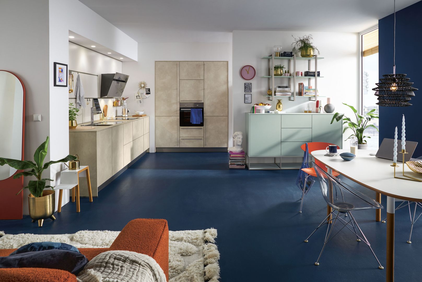 Wie sieht die Küche in den 2020-er Jahren aus? Eines ist klar: Sie ist offen für Neues. Offenes Wohnen ist so aktuell wie nie zuvor, und die einzelnen Lebensbereiche verschwimmen. In der Küche wird gearbeitet, gustiert und gekostet, auch gegessen, gechillt und verweilt. Das nicht mehr so wie vor einigen Jahren meist in klinischem Weiß, sondern in eher dunkleren Tönen. Dabei reicht der Bogen von Anthrazit über Mitternachtsblau und Tannengrün bis zu dunklen Hölzern, in die sich immer wieder ein neuer, leichter Rosé Ton mischt und für frischen Wind sorgt. Diese Farbwelt ist oft matt, in Anti-Fingerprint Optik, meist grifflos und mit vielen praktischen Details gespickt. Es gibt unzählige Varianten, um typische Küchenhelfer verschwinden zu lassen, die dann mit einem Handgriff sofort parat sind. Die Zeiten, in denen die Küche offensichtlich mit ihren technischen Hilfsmitteln geprahlt hat, sind Schnee von gestern. Alle Linien sind klar und puristisch. Die Küche beeindruckt als stylishes Designmöbel und Blickfang zugleich.